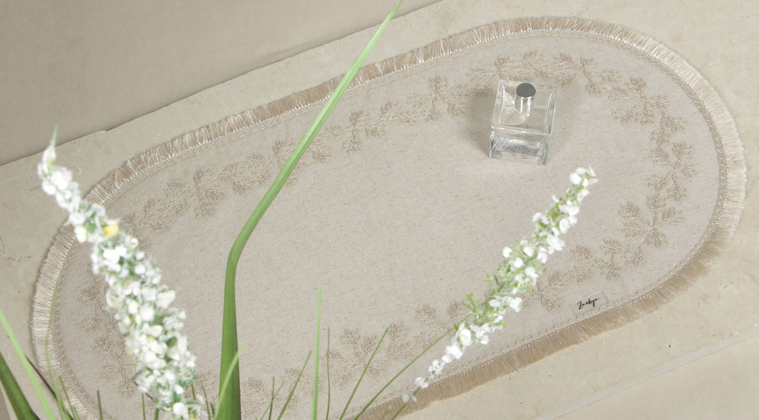 la napperon AZALEA avec ses formes rondes et ovales, est délicatement brodé de motifs floraux, orné de méches en extrimité, évoquant l’élégance intemporelle et la finesse artisanale