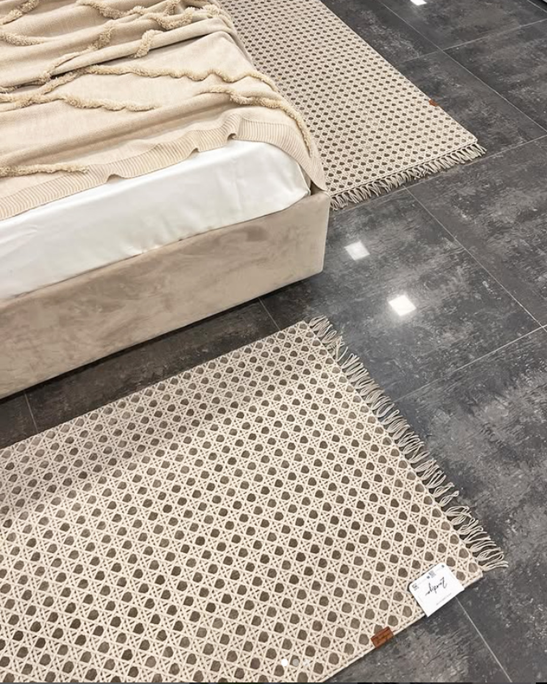 Explorez le raffinement avec notre série de tapis pour chambre à coucher, inspirée du motif canage de Dior. Ces tapis tissés à plat avec un fil en laine offrent une solution parfaite pour les personnes allergiques, alliant confort et praticité. Le motif classique et chic du canage ajoute une touche d’élégance intemporelle à votre chambre, créant ainsi une atmosphère de luxe discret. Avec des franges finement travaillées en bordure, ces tapis ajoutent une touche finale sophistiquée à votre espace de repos, transformant votre chambre en un sanctuaire de style et de confort.